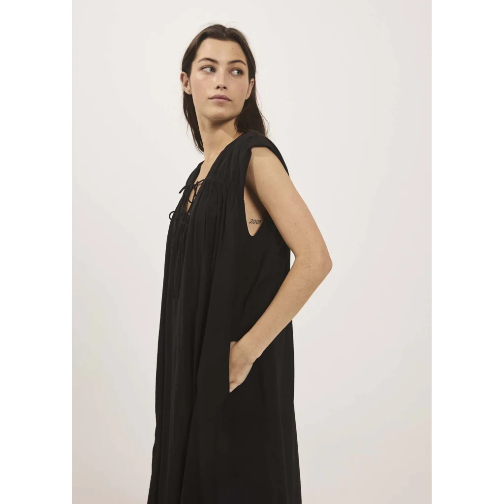 Alyssa Midi Dress fra NORR. En avslappet, casual og komfortabel midikjole fra NORR. Denne flowy midikjolen er laget i en myk viskosekvalitet. Den har v-hals med snorer og rynker og skjulte sidelommer.