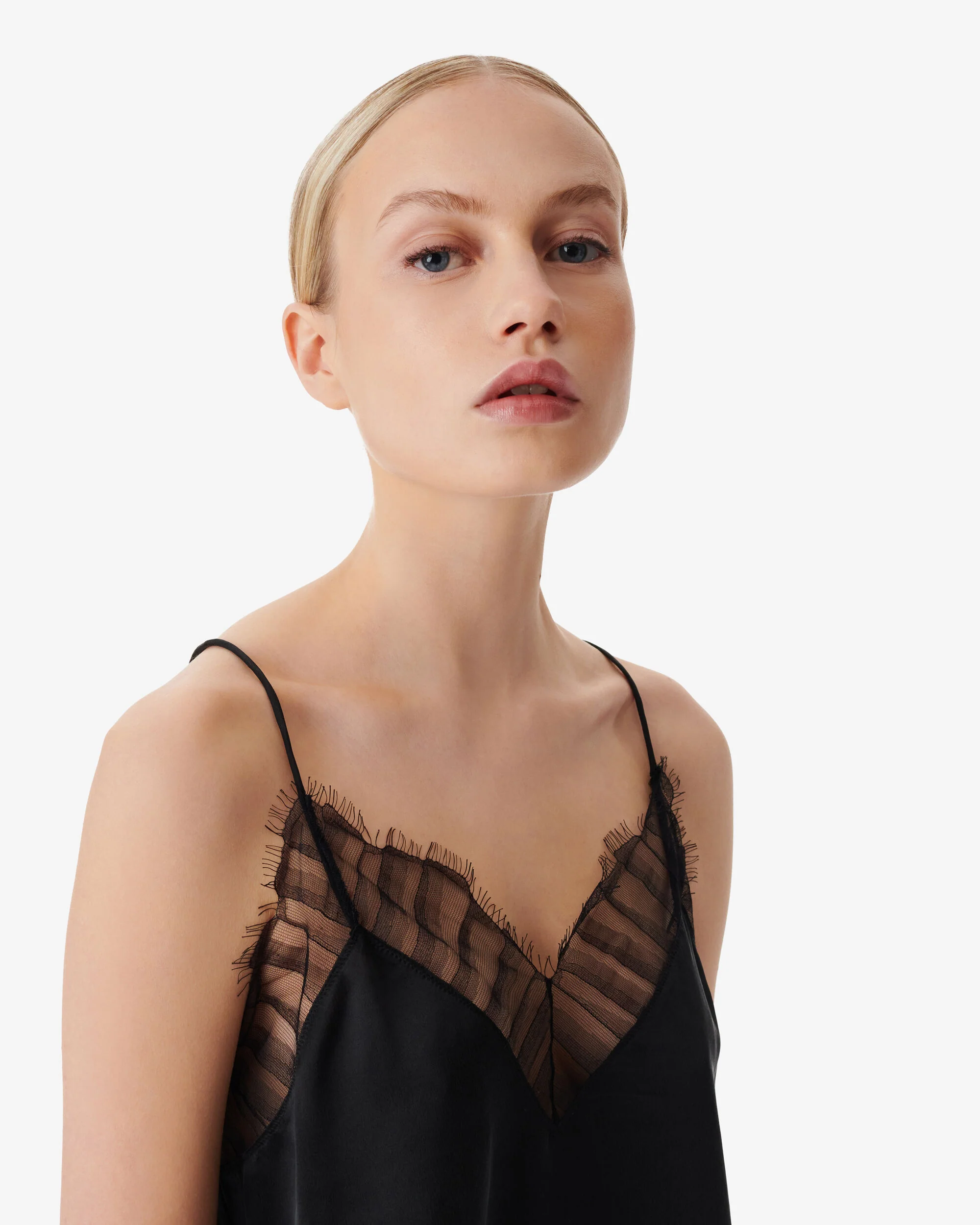 Berwyn fra IRO. Endelig har IRO kommet til Villoid - dette har vi gledet oss masse til! Berwyn er en essensiell IRO-style - feminin og elegant. Toppen har smale spaghettistropper og en feminin blondekant. Løs, luftig passform i luksuriøs silke. Style den gjerne med et par skinnbukser for en look preget av kontraster eller med en shorts på varme sommerdager.