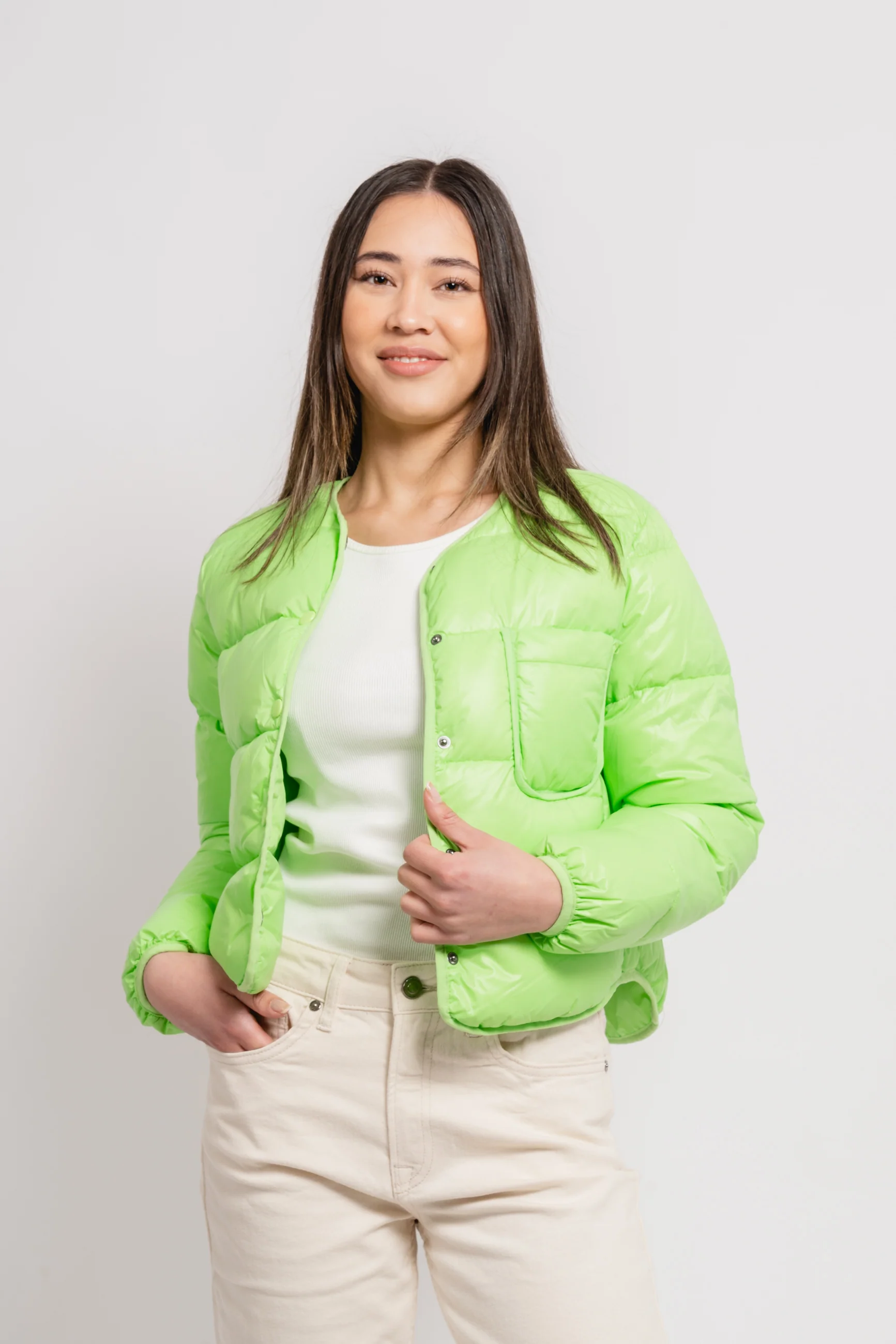 Bonnie Jacket fra Line of Oslo. Denne sesongens kuleste pufferjacket er her. Bonnie Jacket har lange ermer med elastisk, smal mansjett. Jakken har rund hals uten krage, og knappelukking i front. En påsydd brystlomme.