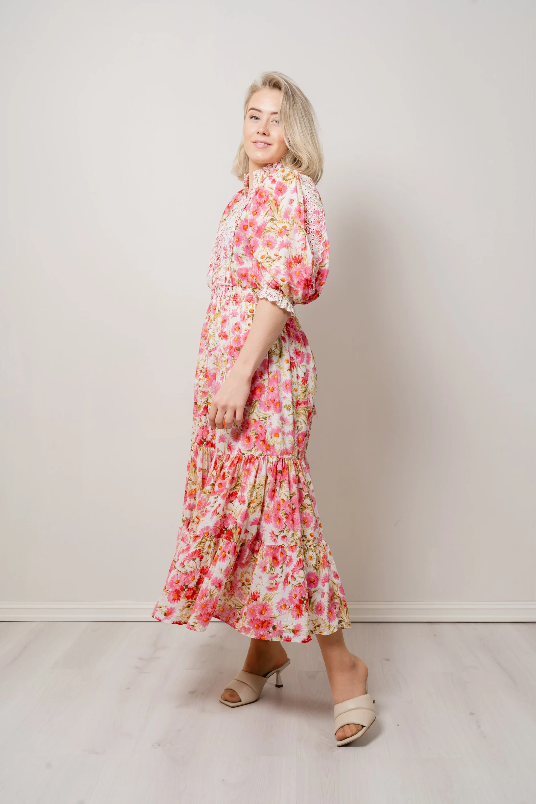Cotton Slub Midi Dress fra byTiMo. Denne nydelige kjolen er kuttet i byTiMos lette og myke GOTS-sertifiserte bomullskvalitet, med slubdetaljer i stoffet. Den har en midi-lengde og går inn i midjen med et belte. Kjolen har oversized, vintage-inspirerte ermer og er satt inn med broderie anglaise detaljer på brystet, ermene, mansjettene og halsen.