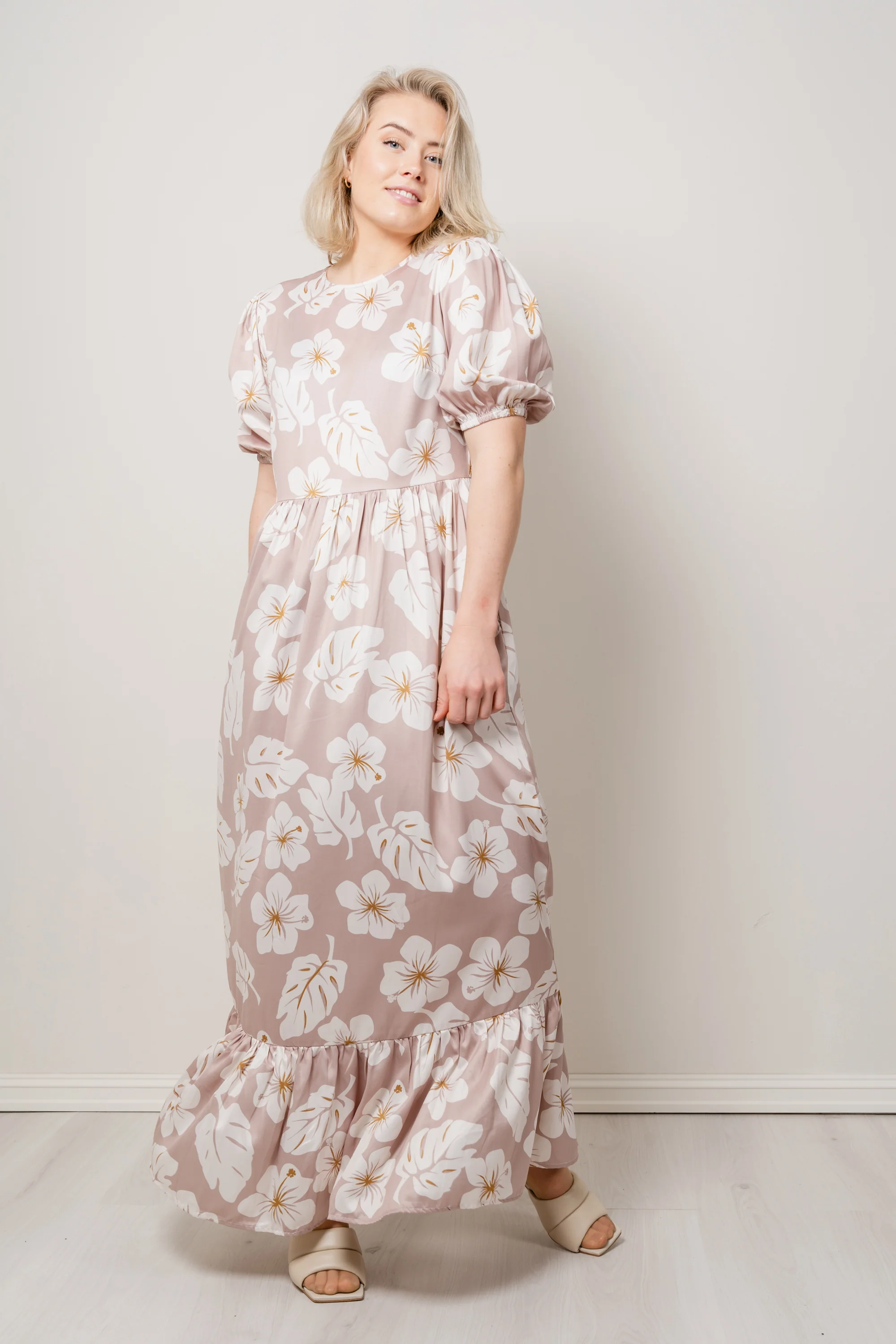 Heaven Dress fra Ane Mone. En lekker maxikjole fra norske Ane Mone. Heaven Dress har korte ermer med en liten puff på skuldrene, og smalt elastisk bånd nederst. Kjolen har rund hals og snittlinje i midjen som definerer midjen fint, uten at passformen blir tettsittende. Heaven Dress har et langt maxiskjørt med volangkant nederst og kommer i et fint blomsterprint.