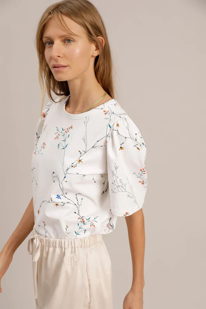 Jinx fra Munthe. En supersøt, feminin t-skjorte fra Munthe. Jinx har korte ermer med liten puff på skuldrene, rund hals og komfortabel, rett passform. T-skjorten har et delikat, pent blomsterprint.