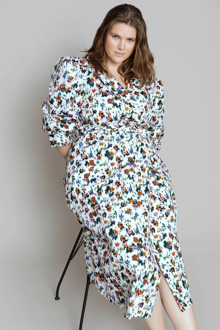 Jita fra Munthe. En superfin midikjole fra Munthe i crisp bomull og omslag. Jita har halvlange ermer med puff, knytebelte i midjen og lommer i sidene. Kjolen har omslagssilhuett som er både flatterende og feminin, og V-hals med slag.