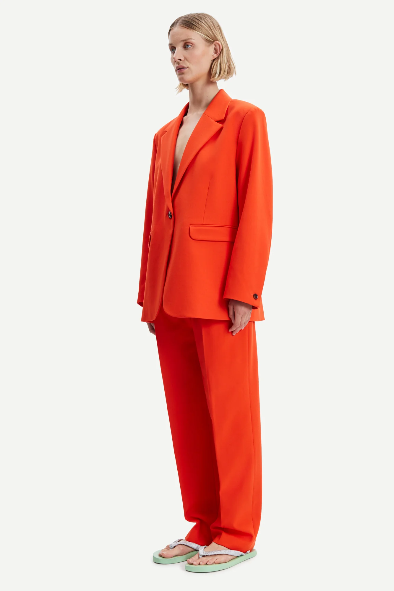 Meme Trousers 13103 fra Samsøe Samsøe. Sesongens kuleste dressbukse kommer fra Samsøe Samsøe. Meme Trousers har rette ben og legg foran. Skrålommer foran, baklomme med knappelukking. Glidelåsgylf, beltehemper. Resirkulert polyester og ECOVERO™ viskoseblandingsstoff med ekstra stretch. Dette produktet inneholder LENZING™ ECOVERO™ viskose, sertifisert med EU Ecolabel for å oppfylle høye miljøstandarder. Style med Haven Blazer for en råkul look.