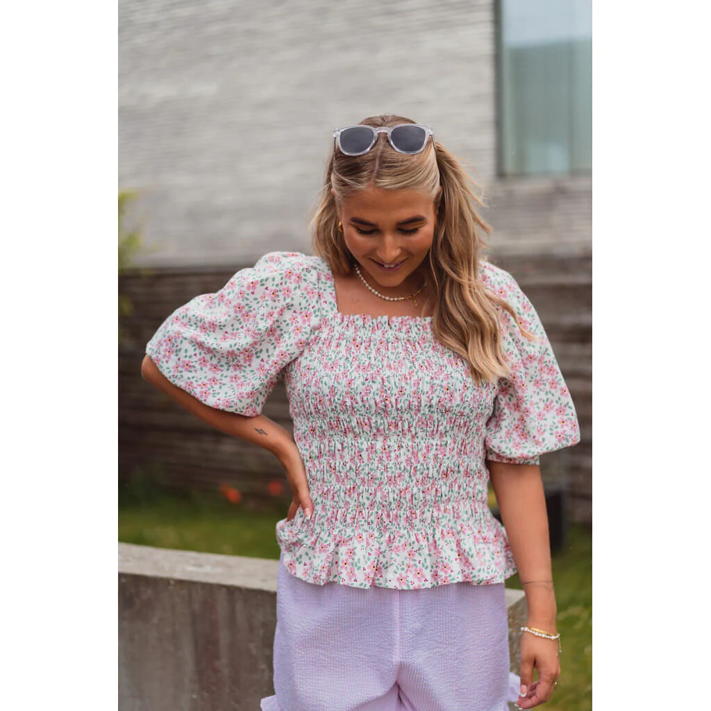 Rikka Top fra A-View. Si hei til vårt nye merke - A-View! Rikka Top er en søt og feminin topp med flatterende smock detaljer og store, luftige ballongermer. Toppen har en firkantet utringning som er skåret lavere bak og en søt rysjedetalj nederst.