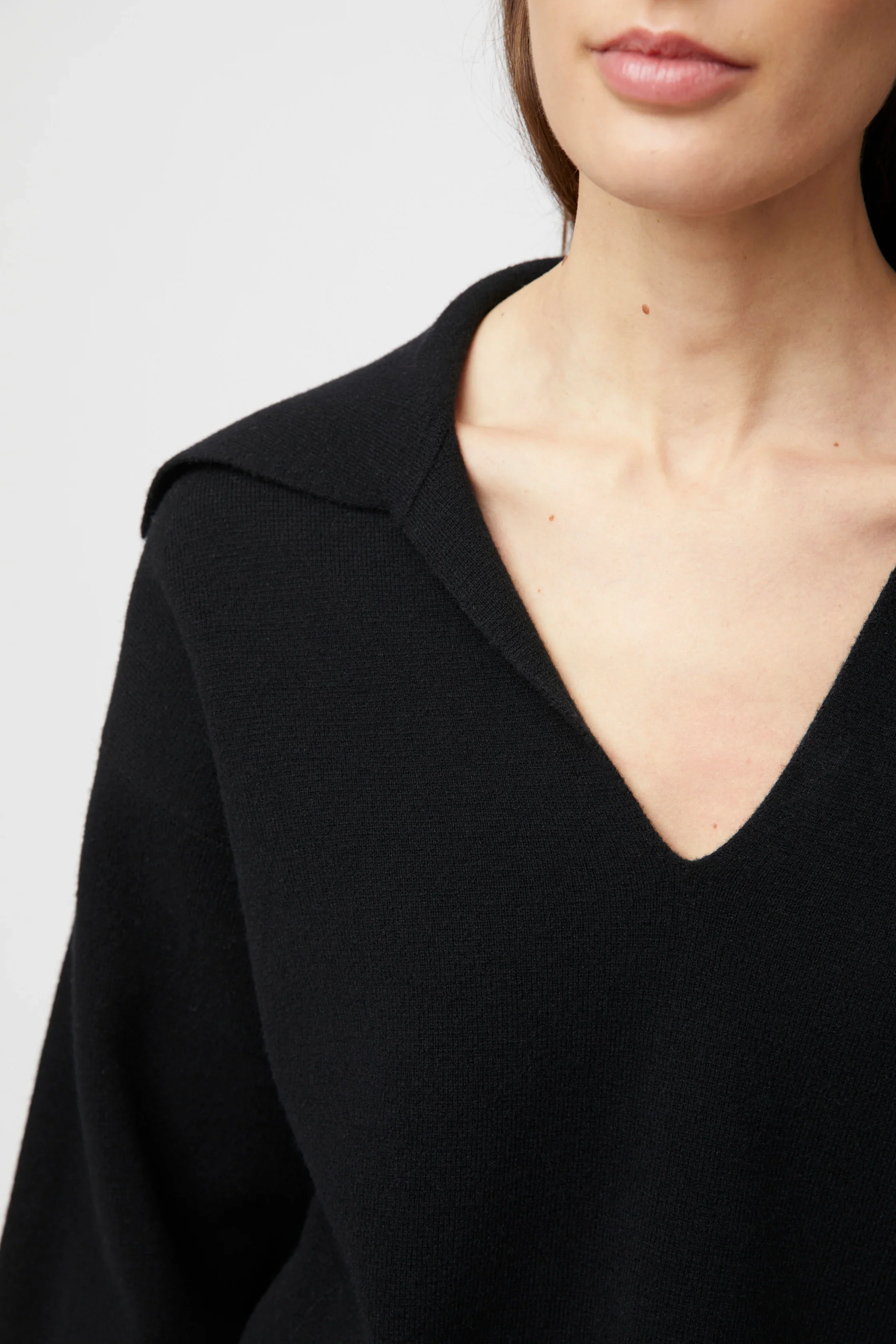 Storm Knit fra FWSS. Storm Knit Jumper er delikat strikket av en ekstra fin merinoull med klassiske og tidløs sort. Denne myke genseren har en pent kuttet V-hals og en skarp krage. For et uanstrengt antrekk - style genseren med et par jeans, eller med dressbukser og loafers.