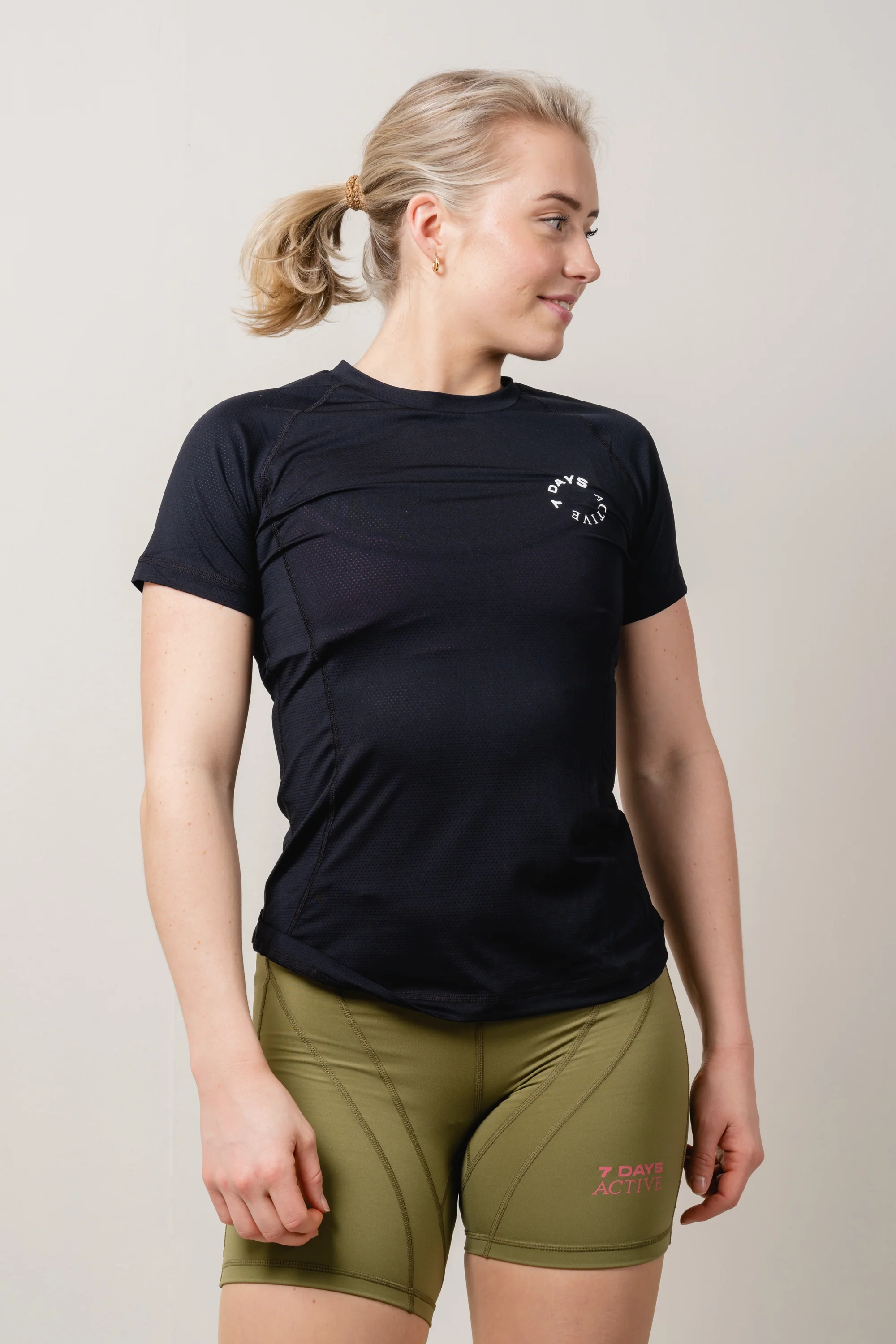 Women's Training Tee fra 7 Days Active. Denne treningst-skjorten er et perfekt for alle typer trening, og har en skulpturert panelkonstruksjon som beveger seg med deg. Meshdesignet er hurtigtÞrkende, og transporterer fuktighet fra kroppen din. Denne figursydde t-skjorten har rund hals og signatursirkellogo pÄ brystet.